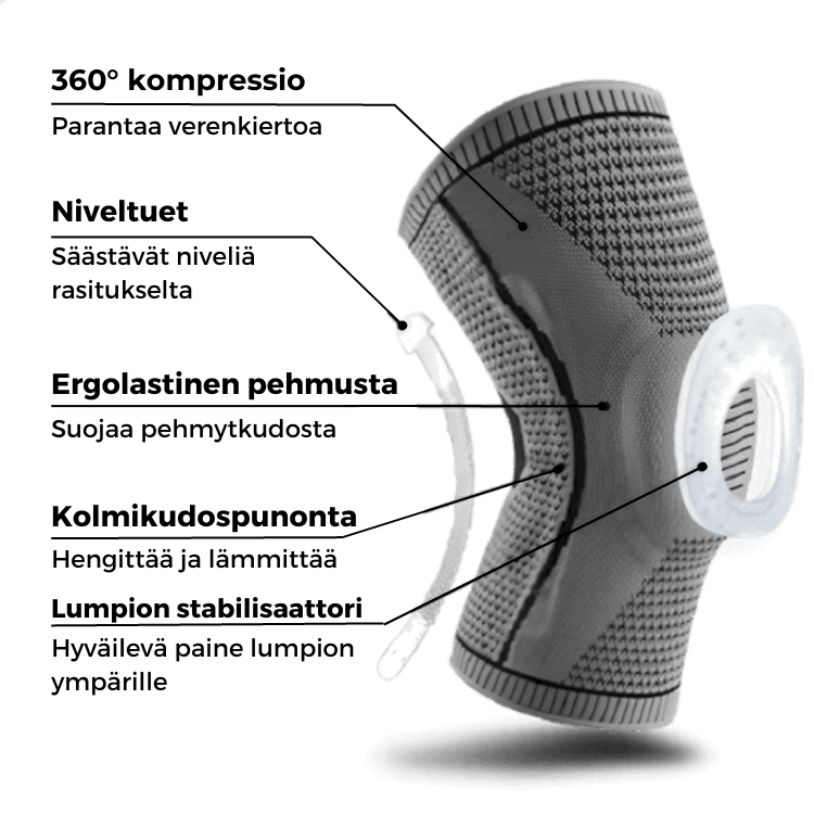 Sivuilla lisätyt vahvat niveltuet tukevat polveasi rajoittamatta polven luonnollista liikerataa.